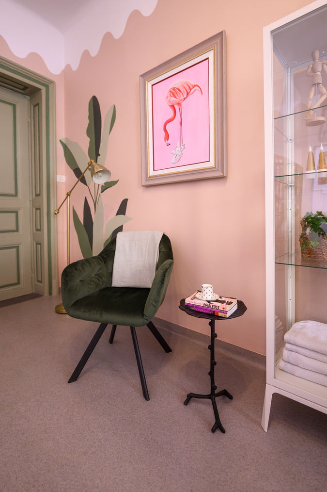 The concept was inspired by the lightness and grace of a flamingo. Delicate powder pink tones combined with shades of green create a relaxing and dreamy atmosphere — something we all need in today’s fast-paced world. Soft waves introduce a sense of movement, elegance, and a hint of extravagance.