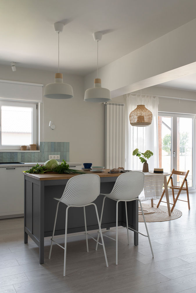 The clients approached us before construction began, allowing us to improve the layout significantly. The redesigned home now features an open-plan space with well-defined zones, convenient circulation, ample storage, and an additional dressing room in the bedroom.